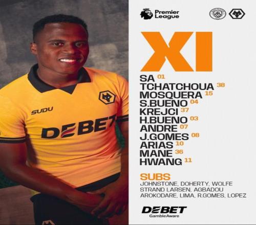 狼队首发:1-若泽-萨、37-拉迪斯拉夫-克雷伊奇、4-圣地亚哥-布埃诺、15-耶尔森-莫斯克拉、3-乌戈-布埃诺、10-阿里亚斯、7-安德烈、8-若昂-戈麦斯、38-查舒亚、11-黄喜灿、36-马特乌斯-马内