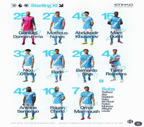 曼城首发:25-多纳鲁马、27-努内斯、45-胡桑诺夫、15-格伊、33-尼科-奥赖利、16-罗德里、20-伯纳多-席尔瓦、4-赖因德斯、42-塞门约、10-谢尔基、7-马尔穆什