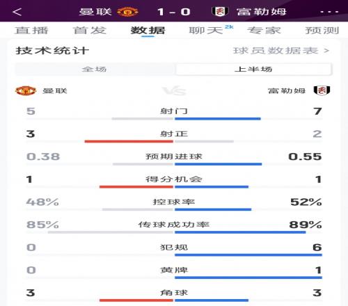 体育播报2月1日宣 本轮英超,曼联半场战罢1-0领先富勒姆,以下为双方半场数据对比: