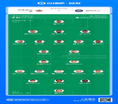 国米首发:1-索默、31-比塞克、25-阿坎吉、95-巴斯托尼、11-路易斯·恩里克、16-弗拉泰西、7-泽林斯基、8-苏契奇、32-迪马尔科、94-埃斯波西托、10-劳塔罗